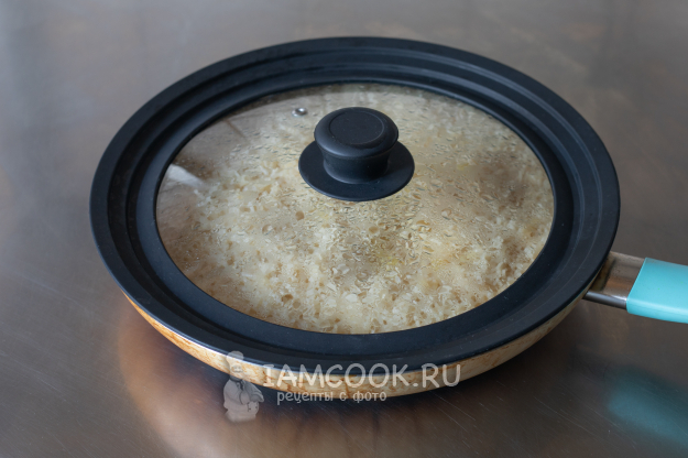 Равномерным слоем рассыпаем рис поверх лука.