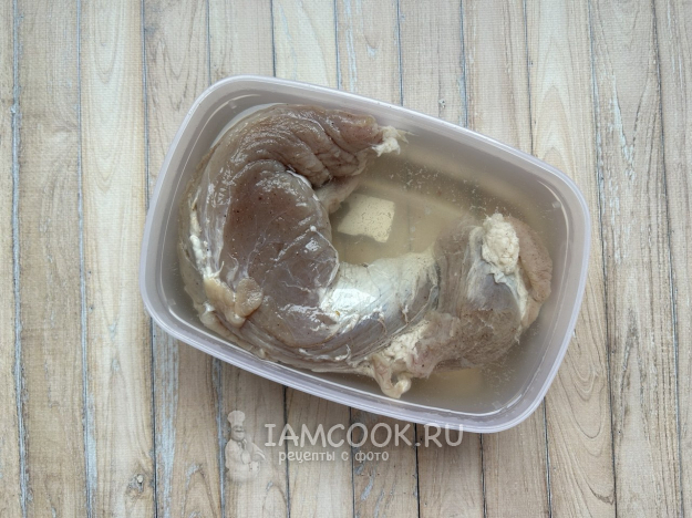 Через два дня достаньте мясо из холодильника, промойте его от соли. Залейте холодной водой и оставьте на 30 минут, чтобы убрать лишнюю соль.