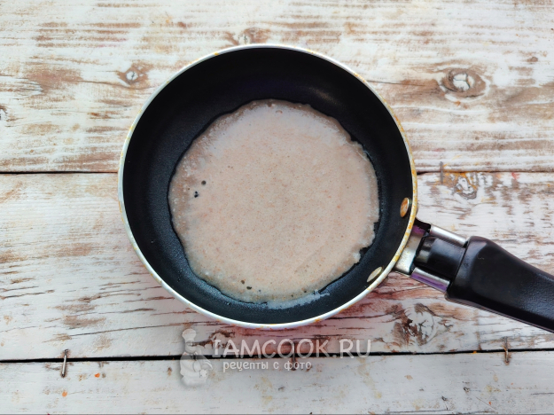 На сковороде для первого блина разогреть масло (в дальнейшем смазывать сковороду необязательно, поскольку в тесте уже оно содержится), вылить немного теста, жарить блинчик на умеренном огне, пока тесто сверху не схватится.