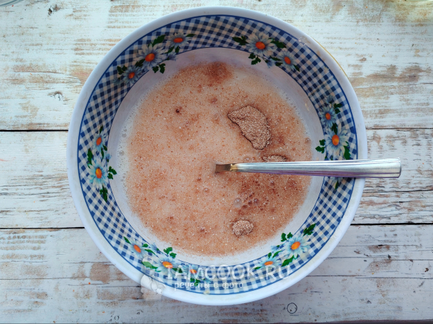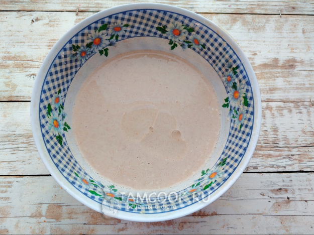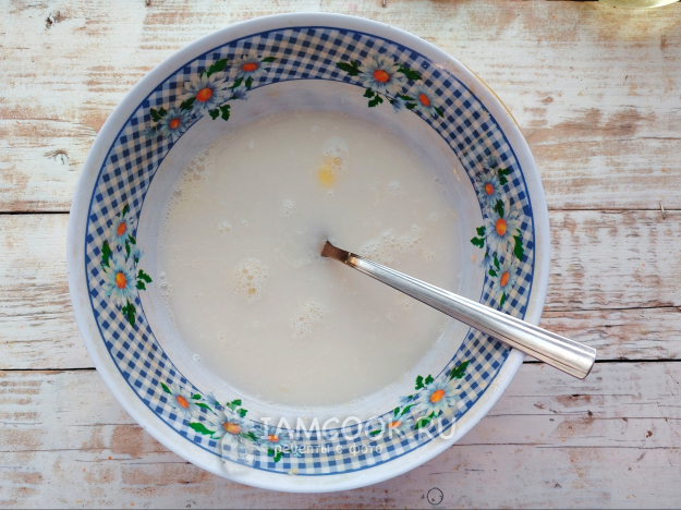 Влить в яичную смесь 50 мл закваски и 150 мл теплой воды.