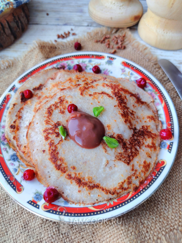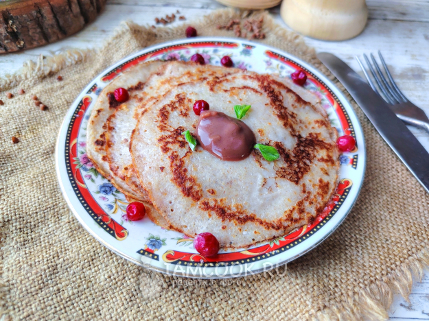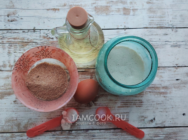 Собрать по списку продукты для блинов на закваске с гречневой мукой. Гречневую муку можно приобрести готовую или сделать самостоятельно, измельчив гречку в кофемолке.
