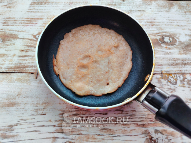 Перевернуть блин, обжарить до румяности со второй стороны. Так поступить со всем тестом.