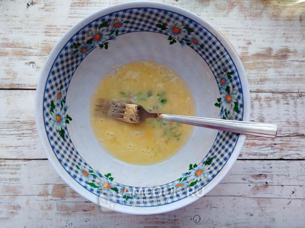 В миске разболтать вилкой яйцо с добавлением сахара и соли.