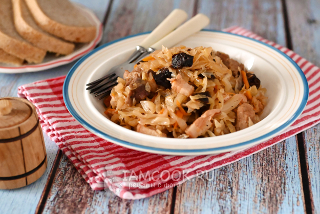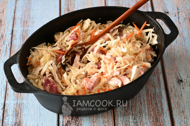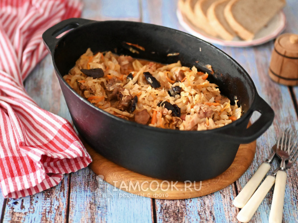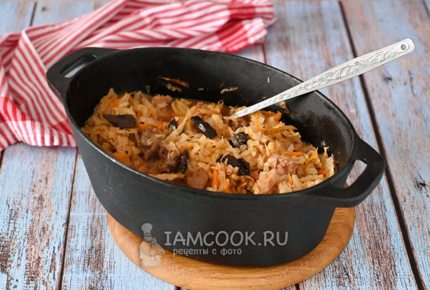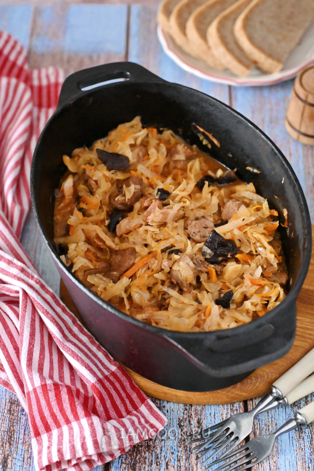 Через 3 часа в доме будет витать аромат тушёной капусты, мяса и копчёностей. Достаньте утятницу с бигусом из духовки и перед подачей перемешайте его.