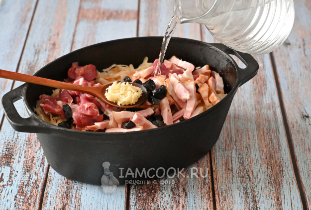 Добавьте измельчённый чеснок и влейте воду. Воды нужно примерно стакан-полтора, чтобы ничего не подгорело. Вместо воды, кстати, в Польше иногда используют вино (и белое, и красное).