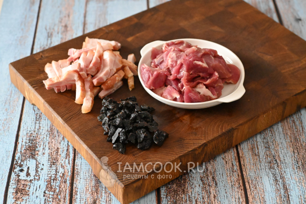 Нарежьте свинину небольшими кубиками. Копченую грудинку нарежьте крупной соломкой. Чернослив вымойте и также нарежьте на небольшие кусочки.