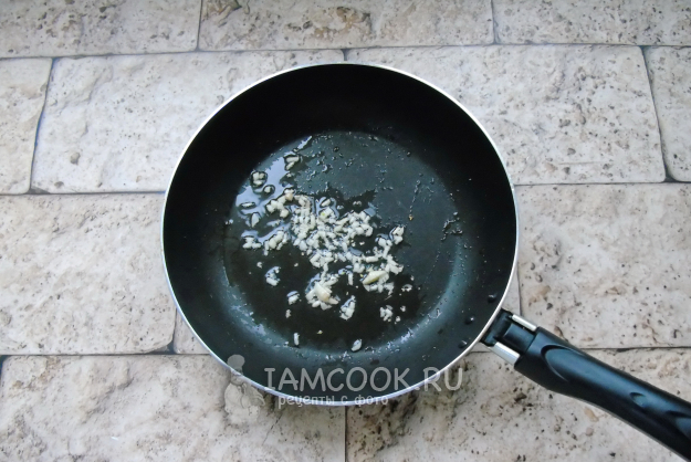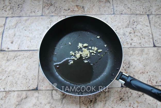 Чеснок мелко нарежьте и выложите в сковороду с растительным маслом.