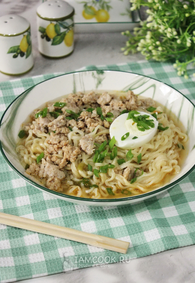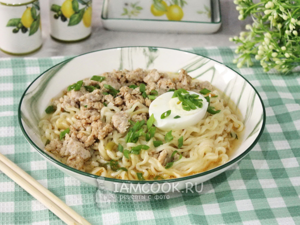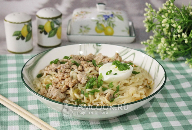 Выложите в тарелку лапшу, фарш, половинку яйца, сваренного вкрутую. Посыпьте нарезанным зеленым луком. Ароматный, сытный и вкусный рамен с фаршем готов.