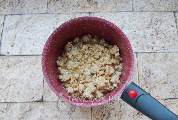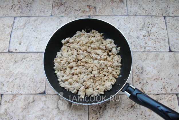 Жарьте 7-8 минут, перемешивая лопаткой, разбивая кусочки фарша.