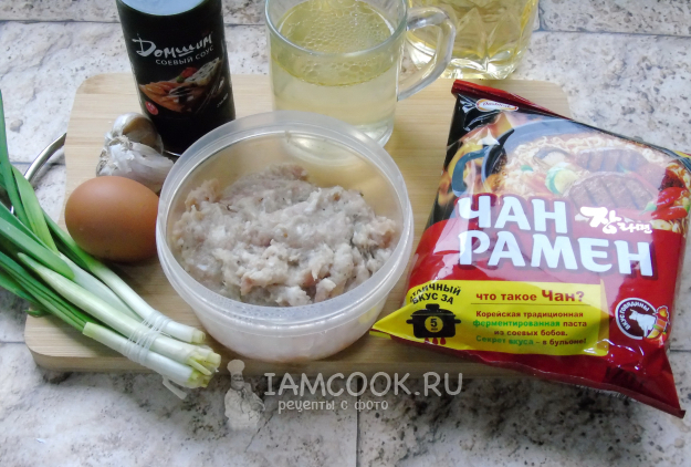 Соберите ингредиенты для приготовления рамена с фаршем.