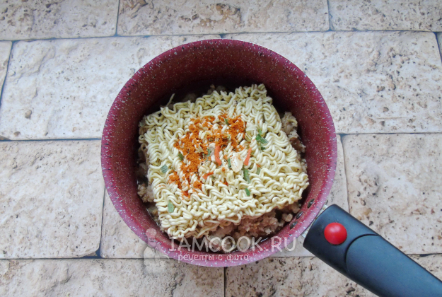 Лапшу рамен достаньте из упаковки. Насыпьте сухие приправы из пакетиков, прилагаемых к лапше.