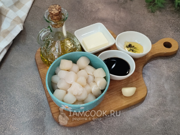 Соберите ингредиенты для приготовления гребешков в соевом соусе на сковороде. Гребешки нужно разморозить заранее, в холодильнике, после откинуть на сито, дать стечь лишней влаге.