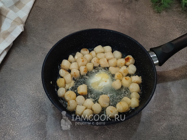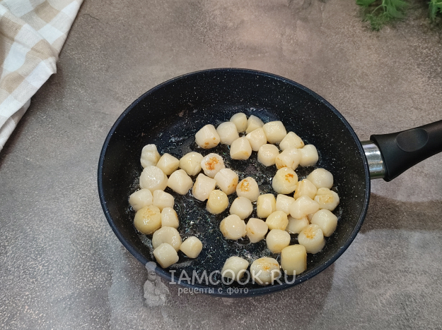 В сковороде разогрейте растительное масло, выложите гребешки, обжарьте до легкой румяности. Если гребешки, несмотря на то, что мы их полностью разморозили и дали стечь лишней жидкости, дадут влагу (их глазируют, как и креветки), ничего страшного, эта вода выпарится, и после гребешки заколеруются буквально за секунды.