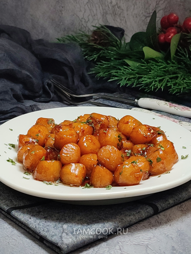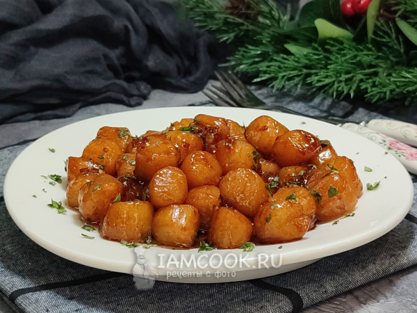 По желанию при подаче добавьте немножко свежей зелени (у меня чуток кинзы), обязательно полейте гребешки глазурью из сковороды.