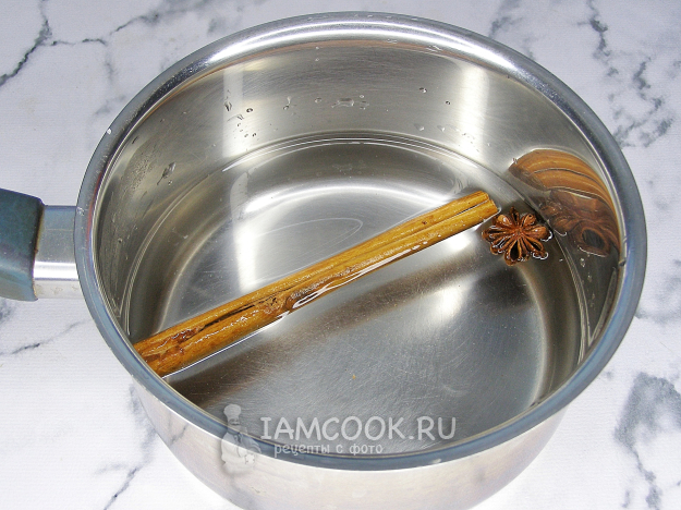 В сотейник наливаем воду, кладём туда палочку корицы и звёздочку аниса и доводим до кипения. Если нет корицы в палочках, то можно добавить молотую корицу. Варим воду с корицей и анисом минут 5.