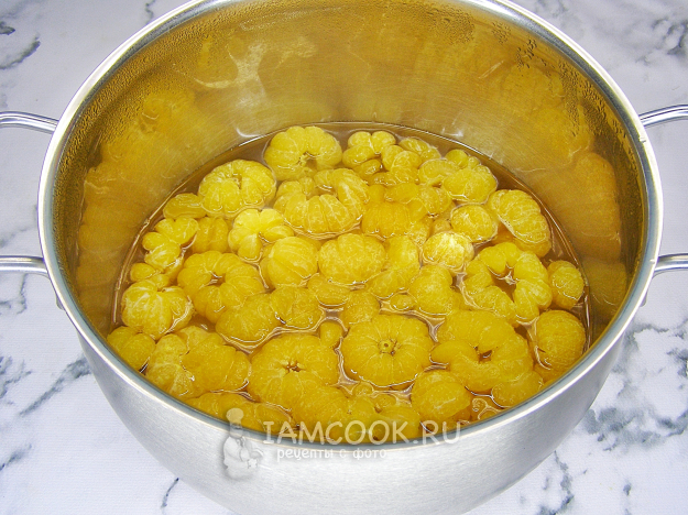 Перекладываем очищенные мандарины в горячий сироп и доводим до кипения. После закипания уменьшаем огонь до минимального и варим 15 минут. Затем снимаем с огня и оставляем полностью остыть.