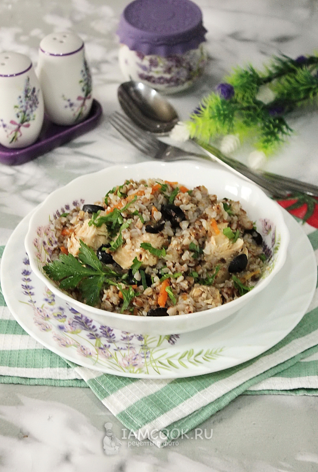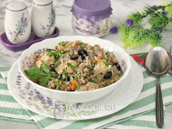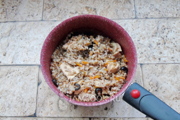 Рассыпчатая, ароматная гречка с рыбными консервами готова.