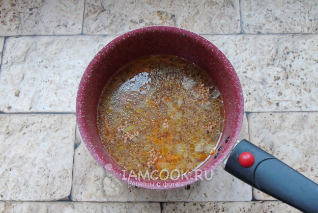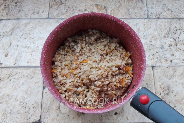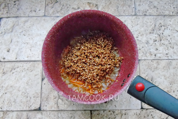 Если нужно, гречку переберите и после хорошо помойте. Выложите в кастрюлю с луком и морковью.