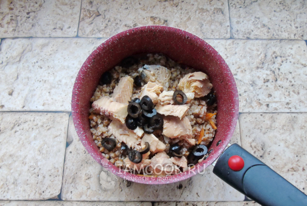 Кашу перемешайте с рыбой и маслинами.