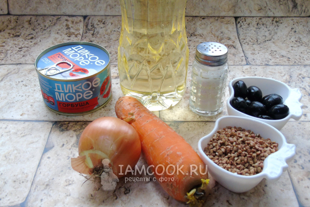 Соберите ингредиенты для приготовления гречки с рыбными консервами.