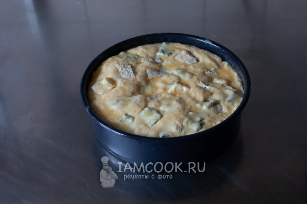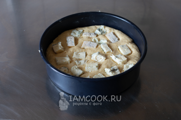 Смажем разъемную форму эмульсией для форм, поместим в неё тесто равномерным слоем и вдавим в него нарезанную кубиками горгонзолу. Поставим тесто в тёплое место (под крышкой или пленкой) и дадим ему подойти приблизительно вдвое (заняло час с небольшим).