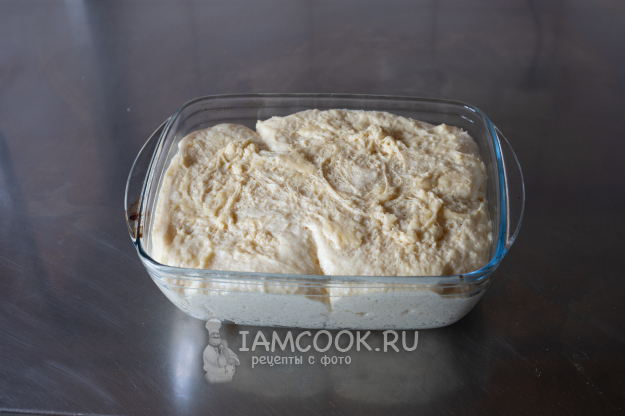 Поместим тесто в слегка смазанную растительным маслом ёмкость, закроем крышкой и дадим постоять в тёплом месте (около 42 градусов), пока тесто не увеличится в объёме вдвое. (У меня заняло примерно 2 часа).
