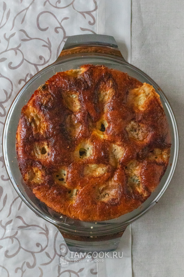 Смажем пирог смесью из яйца и молока, а потом выпечем его в предварительно прогретой духовке при температуре 180°С без циркуляции воздуха на среднем уровне, 30-35 минут. Если пирог покоричневеет раньше времени, его можно до конца выпекания покрыть фольгой.
