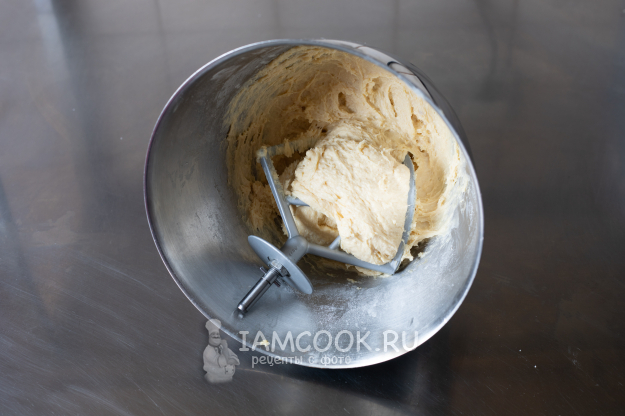 В самую последнюю очередь вмешаем в тесто кусочки масла (желательно забрасывать их в тестомес по одному, чтобы не сбились в комок). После того как тесто станет однородным, вымесим его 5 минут.