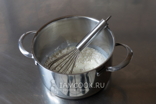 Смешаем в маленькой сковороде или кастрюле молоко с мукой до полного растворения комочков.