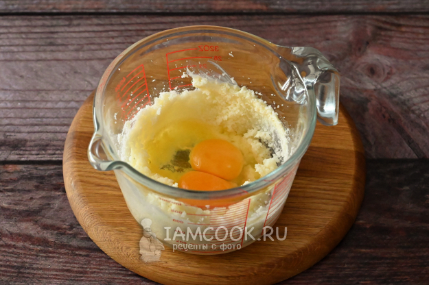Затем добавьте яйца и ещё раз взбейте, чтобы всё соединилось в единую массу.