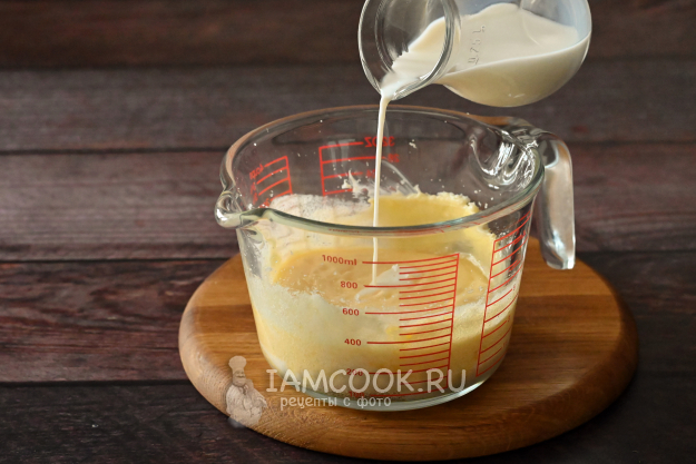 Когда масло с яйцами смешаются, влейте молоко.
