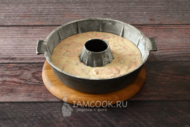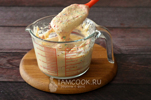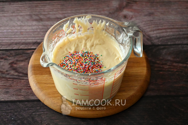 Ну и добавим ярких красок нашему кексу! Всыпьте в тесто кондитерскую посыпку.