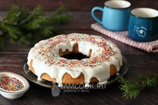 Остывший кекс переверните на тарелку. В "художественном беспорядке" нанесите на кекс сметанную глазурь, распределите ложкой и дайте ей естественным образом стечь по бокам. Декорировать можно той же кондитерской посыпкой, что добавляли в тесто, или как-то иначе, на своё усмотрение.