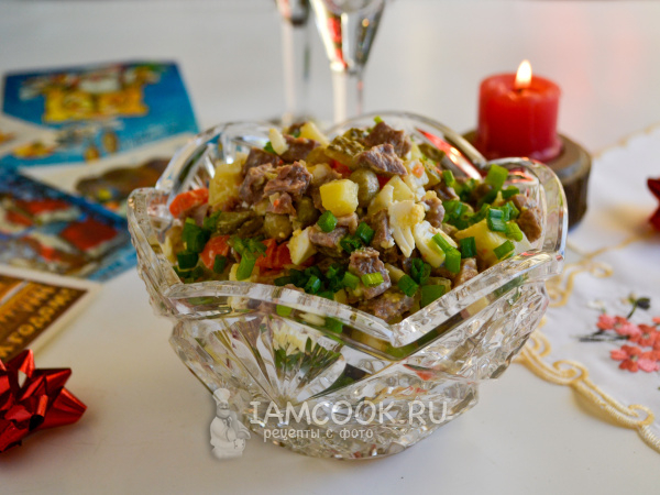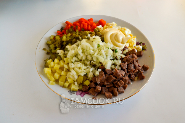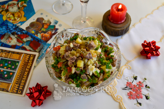 Аккуратно перемешайте, попробуйте на соль, досолите по вкусу. Салат «Оливье» с языком готов.