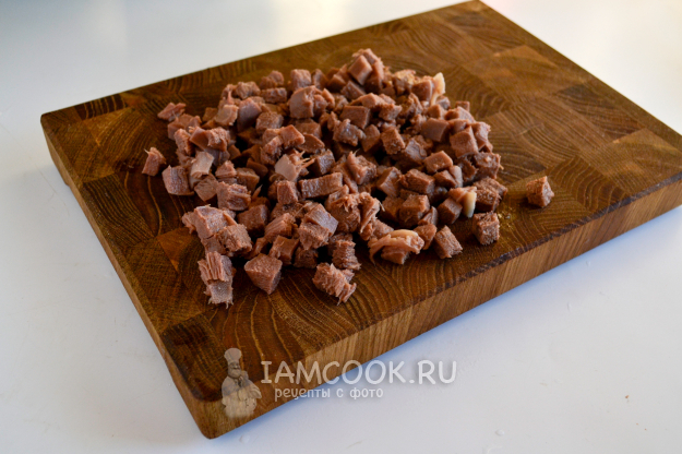 Нарежьте охлажденный язык кубиком. Для салата я использовала примерно половину языка. Оставшуюся часть языка можно просто нарезать, приготовить из него заливное или рулетики с сырной начинкой. Моя сестра нарезала язык кружочками, чуть смазывала майонезом, и в духовку на 10-13 минут, чтобы слегка запекся - вкуснятина получалась.