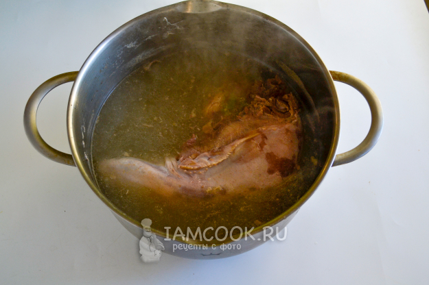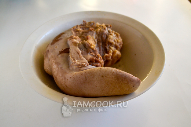 Язык готов. Он легко протыкается ножом. Выньте язык из бульона и охладите под струей холодной воды.