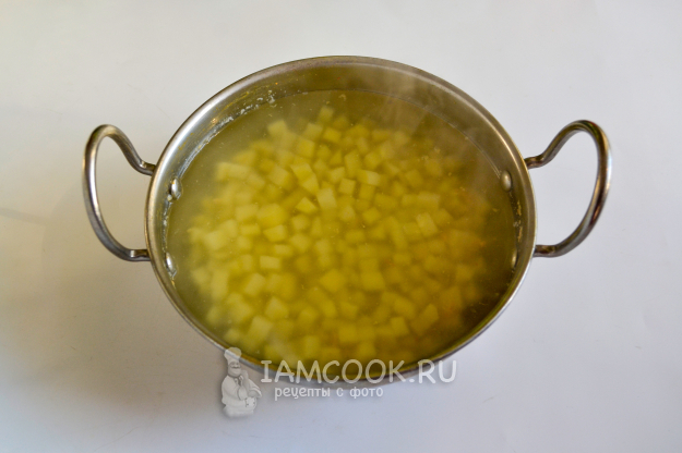 Нарежьте таким же кубиком очищенный картофель и отправьте в кипящую подсоленную воду. После закипания картофель будет готов примерно через 5-6 минут.