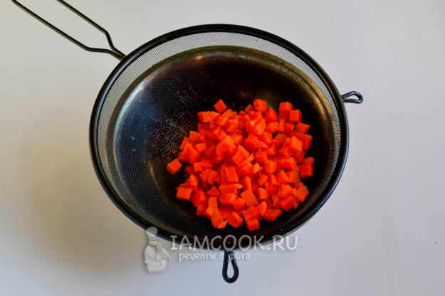 Переложите морковные кубики в дуршлаг, чтобы стекла вода. Морковь охладится и чуть подсохнет.