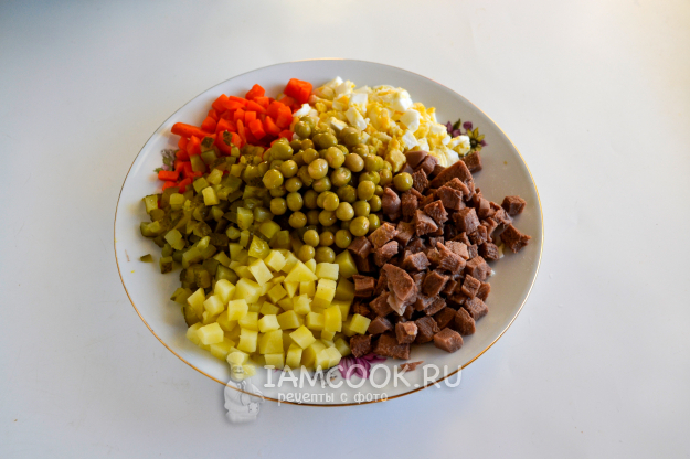 В миску положите нарезанные морковь, картофель, язык, маринованные огурчики, яйца. С маринованного зеленого горошка слейте жидкость и добавьте его к остальным продуктам.
