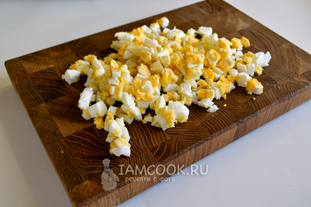 Яйца отварите в течение 5-6 минут. Охладите в холодной воде, очистите и нарежьте кубиком.