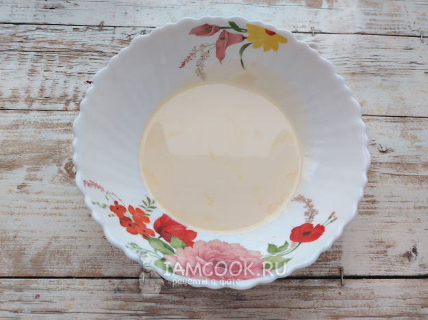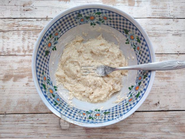 Всыпать просеянную муку, добавить щепотку разрыхлителя. Перемешать, тесто должно получиться густым.