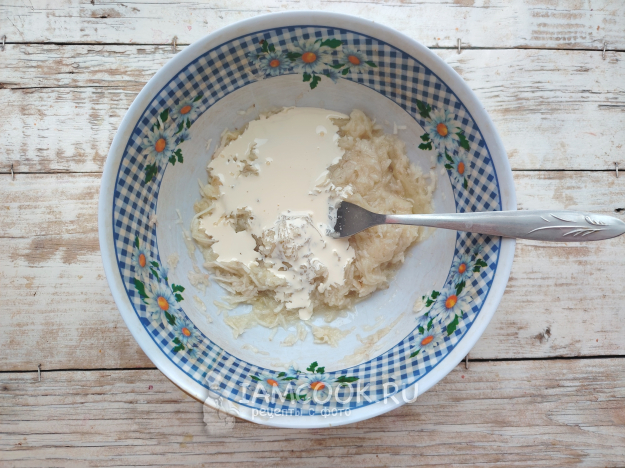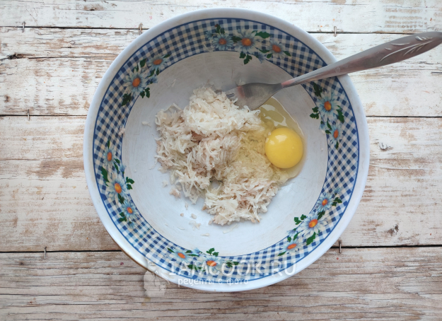 Сыпучие добавить в миску с измельченным корнеплодом, вбить яйцо, размешать содержимое посуды.