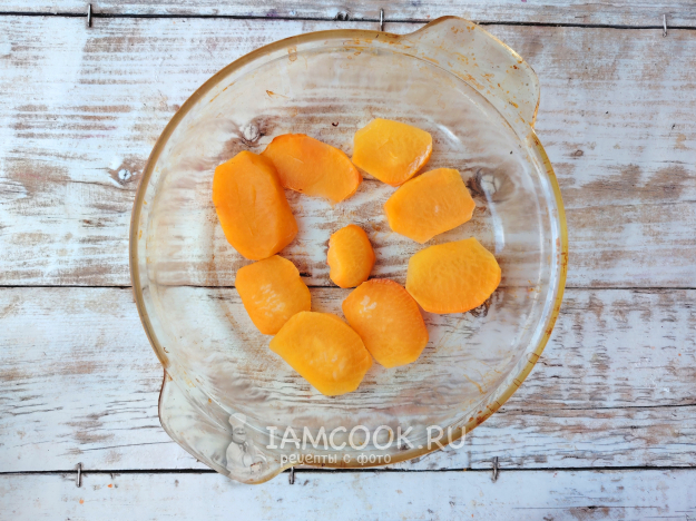 Репу почистить, нарезать на ломтики толщиной около 0,5 см. Влить в форму с овощем воду, чтобы овощные пластинки лишь одной стороной были погружены в нее.