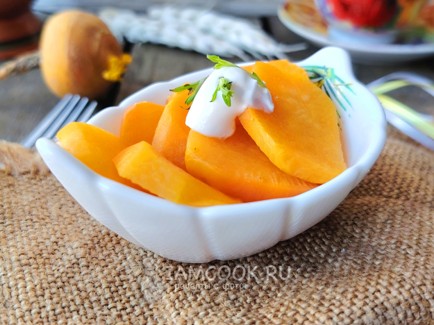 Готовые паренки из репы подать к столу в теплом виде со сметаной и рубленой зеленью либо как гарнир к мясу. Приятного аппетита!