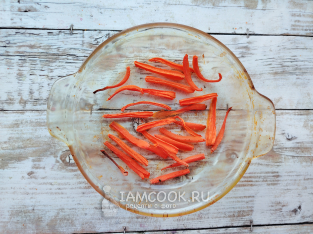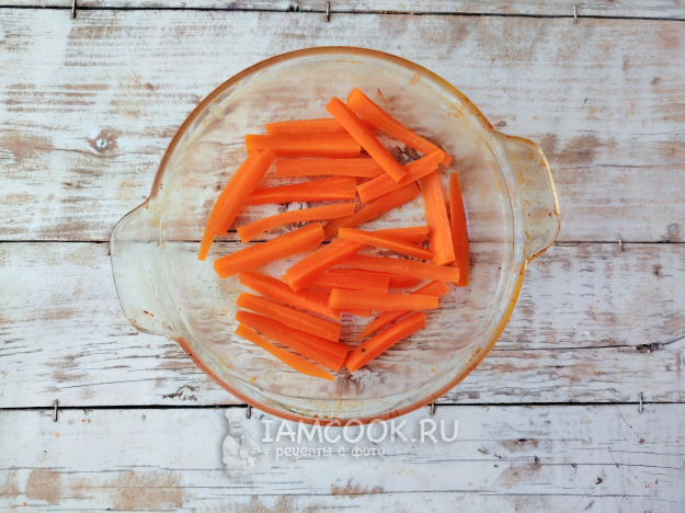 Овощ вынуть из пакета. Когда морковка немного остынет, разрезать корнеплоды на брусочки толщиной около 0,5 см. Разместить их в форме для запекания, чтобы они не задевали друг друга.
