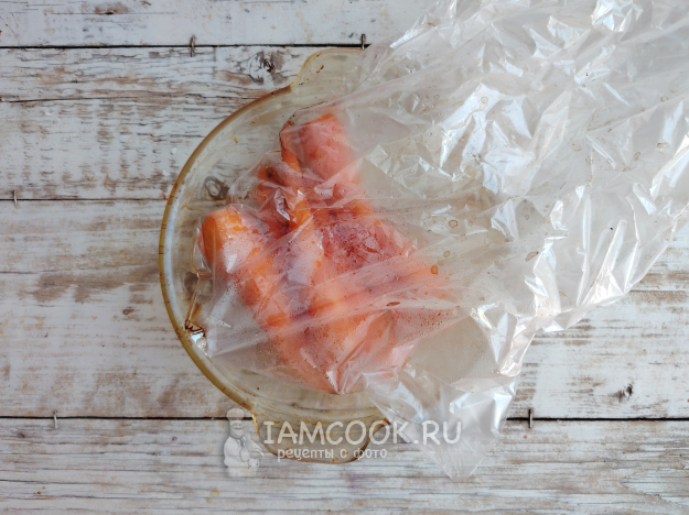 Морковь помыть, почистить, поместить в пакет для запекания, влить в него немного воды. Завязать пакет, сделать вилкой несколько отверстий, чтобы воздух циркулировал.