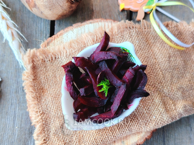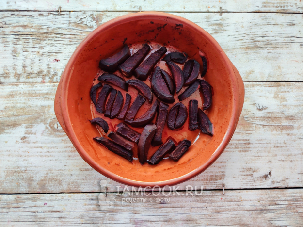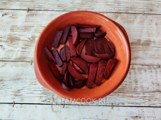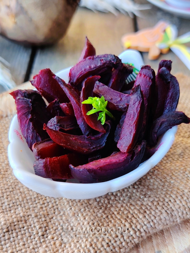 Выложить свекольные кусочки в форму для запекания. Отправить снова в духовку на 20 минут. Подвяливать овощ можно также при 180 градусах, но включить конвектор, чтобы паренки равномерно подсушивались и не пересохли. Они должны быть мягкими и хорошо гнущимися, но не ломкими.