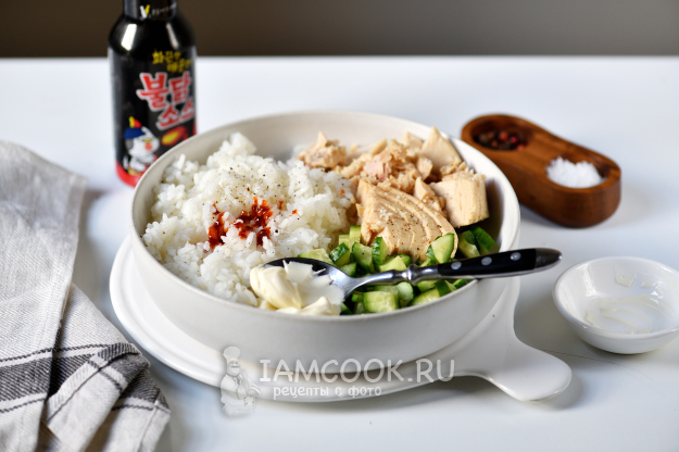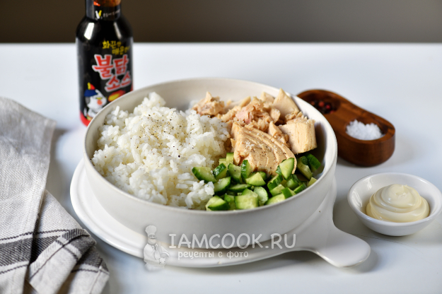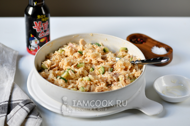 Перекладываем рис в глубокую миску, добавляем консервированного тунца. Предварительно с тунца нужно слить всю воду.