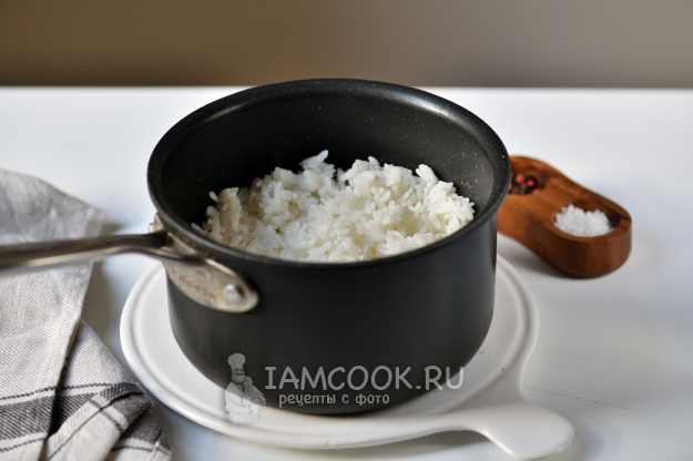 Рис отварите любым удобным для себя способом. В данном случае нам не нужен рассыпчатый рис как на суши, но и каша-малаша тоже. Я варю в небольшом количестве воды на тихом огне 17-18 минут под плотно закрытой крышкой. Дальше крышку открываем, и даем рису остыть до еле теплого состояния.