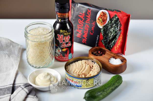 Все необходимые продукты для приготовления риса с консервированным тунцом и нори - перед вами.